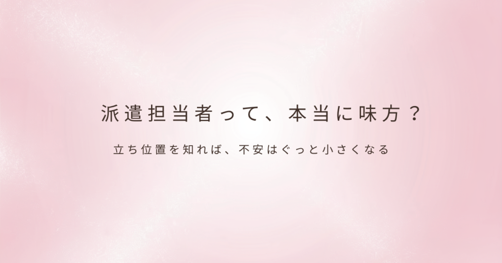 派遣で働くことを決めた瞬間から、必ず関わる存在がいます。それが派遣会社の担当者です。求人票を見るだけでは分からない部分や、職場との細かな調整を担うのが担当者であり、実際に働き始めてからの安心感や不安の大きさは、この担当者との関係に左右さ...